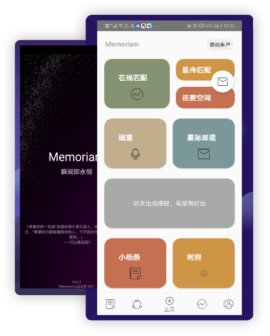 虽然活跃人数不多,app里已经有一些功能帮助大家互相认识。小星星可以尝试在线匹配用户和匹配星舟,也就是菜单右边的按钮都是可以和在线的小星星交流
